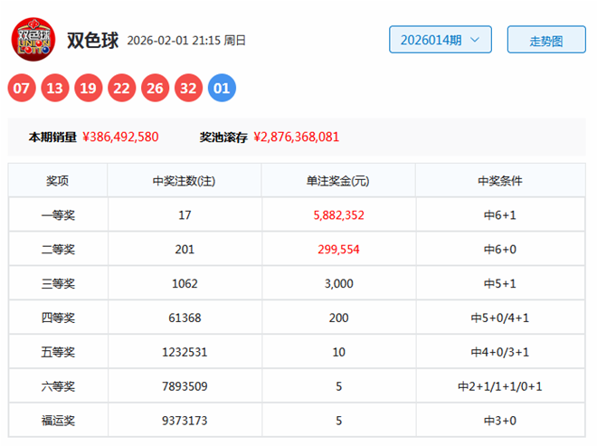 开奖回顾:第2026014期双色球奖号为07、13、19、22、26、32+01。区间比:1:3:2,奇偶比:3:3,首尾间距:25。