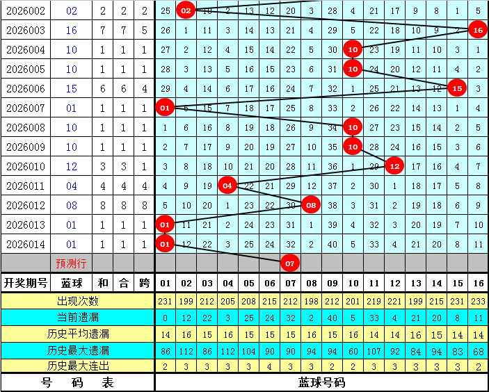 上期开奖:福彩双色球第2026014奖号开出:07 13 19 22 26 32 + 01,红球号码和值为119,首尾间距为25,无连号。