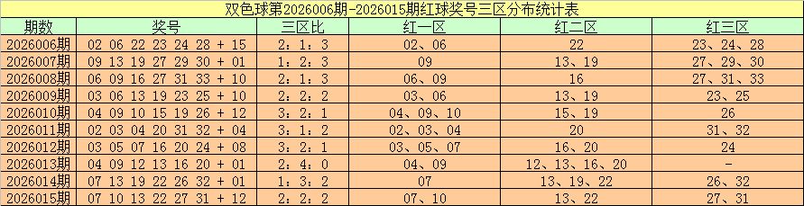 双色球第2026015期奖号为:07 10 13 22 27 31 + 12,红球三区比为2:2:2。