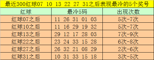 红球冷码统计:双色球第2026015期开出红球奖号分别为:07、10、13、22、27、31,在最近300期开奖中,各号码出现之后其下期出现最少的5个红球分别为: