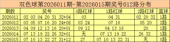 开奖回顾:双色球第2026015期开出奖号:07 10 13 22 27 31 + 12。其中,红球号码012路比为1:5:0,其中1路号码表现活跃。蓝球号码为0路号码。
