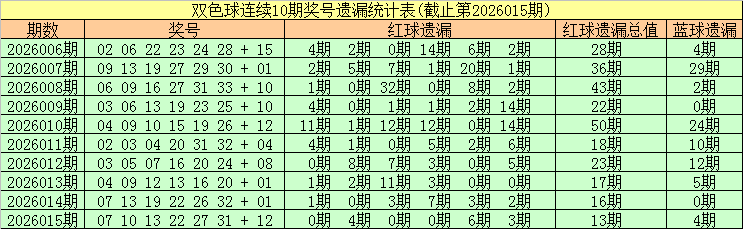 截止双色球第2026015期,最近10期红球遗漏总值分别为:28期、36期、43期、22期、50期、18期、23期、17期、16期、13期,上期遗漏总期数相对较低。