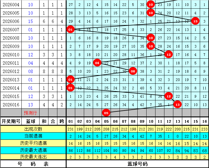 蓝球分析:上期蓝球开出号码13,上升1个点位,最近10期蓝球号码升平降分别为:降、升、平、升、降、升、降、平、升、升,本期看好蓝球下降,独蓝参考05。