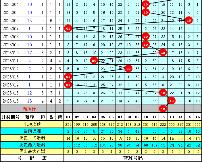 连号分析:上期红球包含连号,最近5期开出2期连号,最近10期包含连号的奖号有5期,连号走势较冷,本期关注连号出现,参考连号13、14。