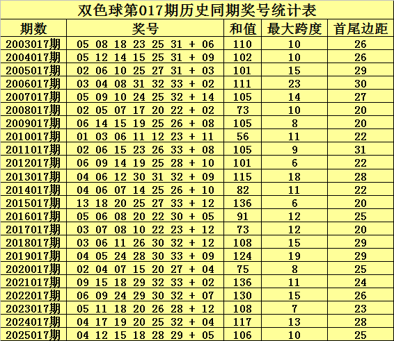 最大跨度推荐:在第017期历史同期开奖中,红球最大跨度全部在6-23之间开出,今年同期适当关注10附近的最大跨度开出。