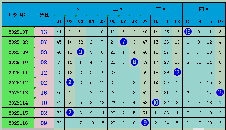 上期蓝球开出号码09,近十期蓝球在一区开3枚,二区开出号码2枚,三区开出3枚,四区开出2枚,区间比3:2:3:2,本期推荐蓝球出现在二区,重点关注06。