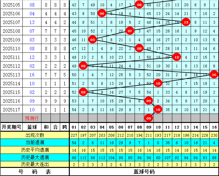 蓝球:历史同期0路号开出:03、09、12、15;1路号开出;01、04、10、13、16;2路号开出;05、08、11、14,蓝球012路个数比为5:8:8,目前0路号历史同期相对较冷,遗漏6年,今年同期适当关注回补,看好蓝球09。