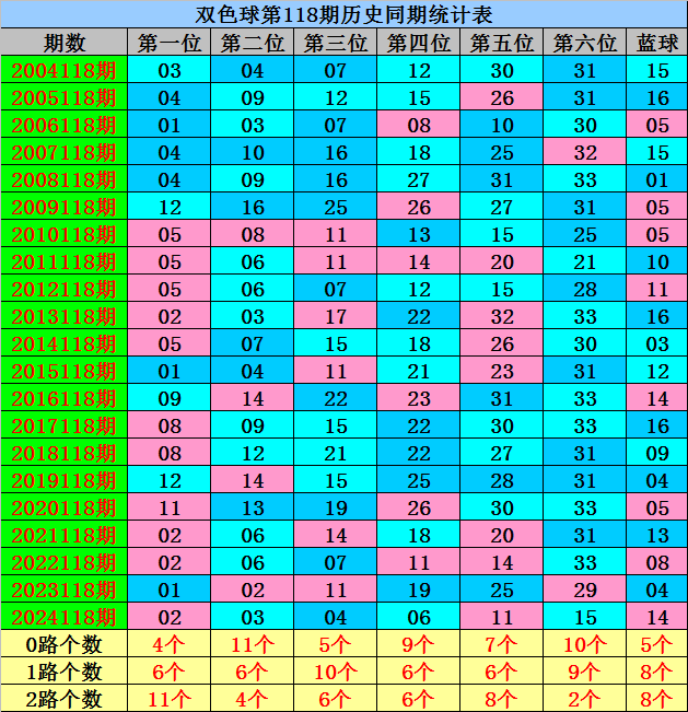 第三位:历史同期0路红球开出:12、15、21;1路红球开出;04、07、16、19、22、25;2路红球开出;11、14、17,红球012路个数比为5:10:6,目前0路红球历史同期相对较冷,遗漏5年,今年同期适当关注回补,看好红球15。
