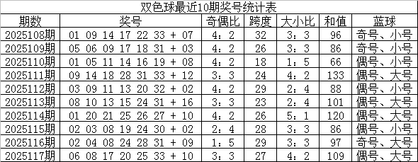 双色球第2025117期奖号为:06、08、17、20、25、33+10。其中红球和值为109,奇偶比为3:3,大小比为4:2,蓝球为偶数、大号。