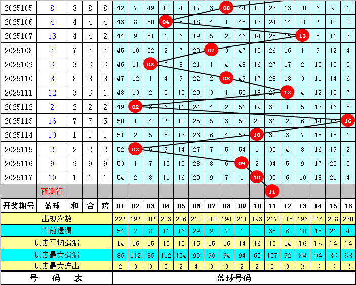 蓝球分析【一区01-04,二区05-08,三区09-12,四区13-16】:上期蓝球为10,出现在第三区,近50期区间比为6:18:9:17,近10期区间比为3:2:4:1,本期预计第三区蓝球再出,参考蓝球11。