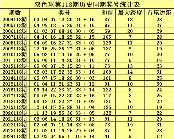 最大跨度推荐:在第118期历史同期开奖中,红球最大跨度全部在5-20之间开出,今年同期注意低位最大跨度出现,参考最大跨度8。