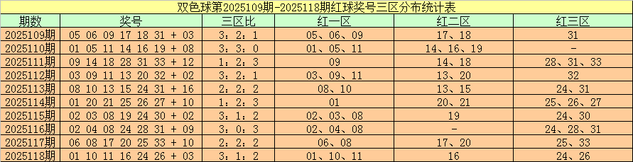 双色球第2025118期奖号为:01 10 11 16 24 26 + 03,红球三区比为3:1:2。