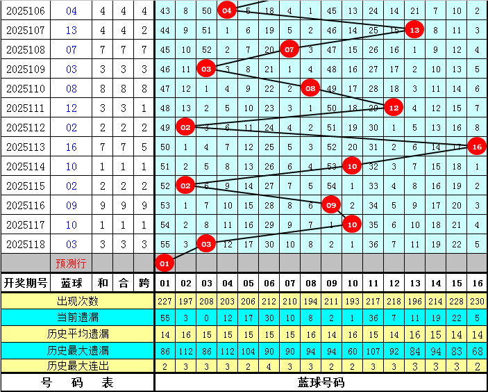 周四0路蓝球和1路蓝球码,走势相对较热,开出概率为70%。