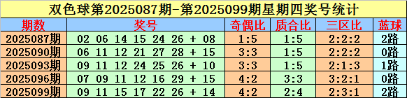 双色球在第2025087期-第2025099期周四开奖中,红球奇偶比累计为15:15,基本持平;红球质合比累计为8:22,质数号码开出相对较少;红球三区比累计为11:10:9,三区号码出现个数基本相当。