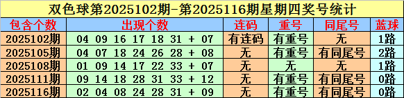 双色球在第2025102期-第2025116期周四开奖中,连码组合出现了1期,开出比例相对较低;重号出现了4期,表现相对较热;同尾号码出现了3次,走势相对较冷。