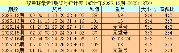 开奖回顾:双色球第2025118期奖号为:01 10 11 16 24 26 + 03,红球和值为88,奇偶比为2:4,大小比为2:4。蓝球开出奇数。