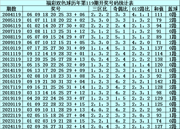 在第119期历史同期奖号中,红球三区分布总比例为40:39:47,奇偶总比例为67:59,012路比为44:41:41,和值分布在71-142之间,蓝球号码012路总比例为8:7:6。