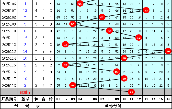 蓝球推荐:蓝球上期开出奖号03,为奇数蓝球,本期预计蓝球继续开出奇数号码,蓝球参考01、04、05、11、13。