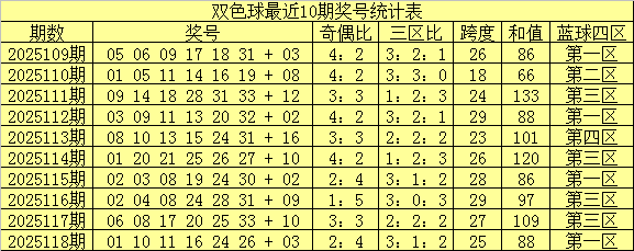 南华天第2025119期双色球区间号码个数统计分析:(红球:01-11为一区,12-22为二区,23-33为三区;蓝球:01-04为一区,05-08为二区,09-12为三区,13-16为四区)