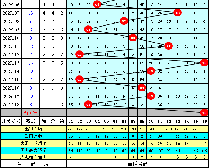 蓝球分析:在第119期历史同期开奖中,蓝球号码奇偶比为11:10,最近5年同期奇偶走势为:奇、奇、偶、奇、偶,今年同期预计再出偶数蓝球,推荐蓝球16。
