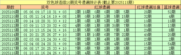 安队第2025119期双色球遗漏分析:(热码:遗漏0-3期,温码遗漏4-9期,冷码遗漏10期及以上)