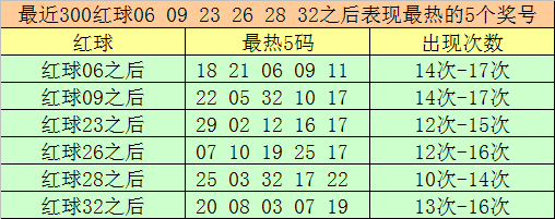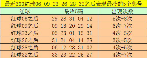红球冷码统计:双色球第2025119期开出红球奖号分别为:06、09、23、26、28、32,在最近300期开奖中,各号码出现之后其下期出现最少的5个红球分别为: