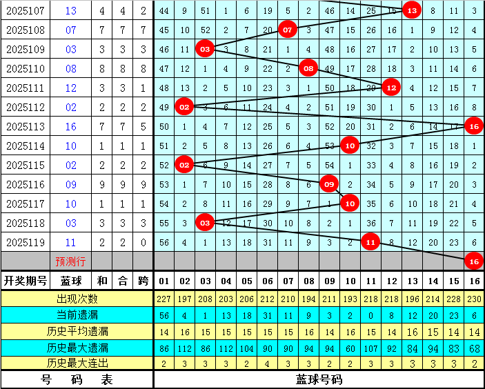 上期开出蓝球号码11,该号码在最近300期中出现了26次,其下期分别开出:蓝球04、11出现4次,蓝球06出现3次,蓝球03、13、15、16出现2次,蓝球02、05、09、10、12、14出现1次,蓝球01、07、08出现0次。本期五码蓝球参考08、09、11、13、16,独蓝关注16。