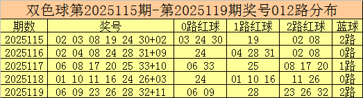 开奖回顾:双色球第2025119期开出奖号:06 09 23 26 28 32 + 11。其中,红球号码012路比为2:1:3,其中2路号码表现活跃。蓝球号码为2路号码。