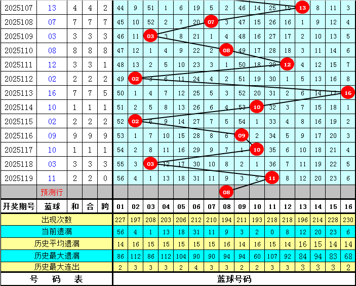 2路红球号码:上期开出了3个,表现相对活跃。最近5期开出12个2路红球号码:02 08 11 17 20 23 26 32,其中2路红球号码大小个数相等,奇数2路红球号码表现活跃。本期参考2路红球号码:14 17 23 26 29 32。