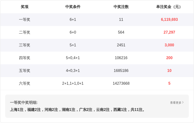 双色球25119期开奖结果06 09 23 26 28 32 + 11,和值124,三区比2:0:4,蓝球号码大小为大号、012路为2路。