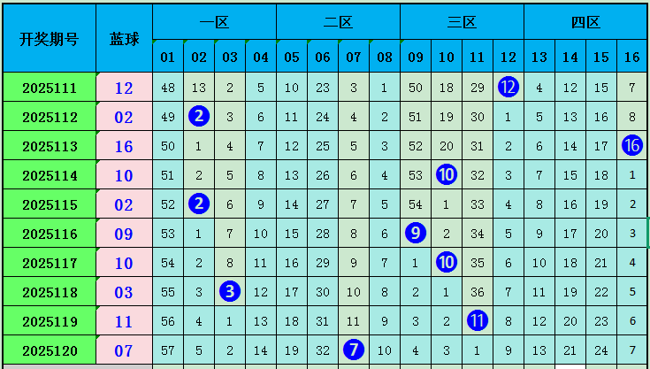 上期蓝球开出号码07,近十期蓝球在一区开3枚,二区开出号码1枚,三区开出5枚,四区开出1枚,区间比3:1:5:1,本期推荐蓝球出现在一区,重点关注02。