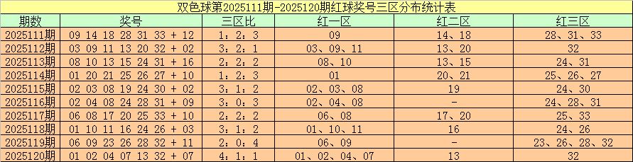 双色球第2025120期奖号为:01 02 04 07 13 32 + 07,红球三区比为4:1:1。