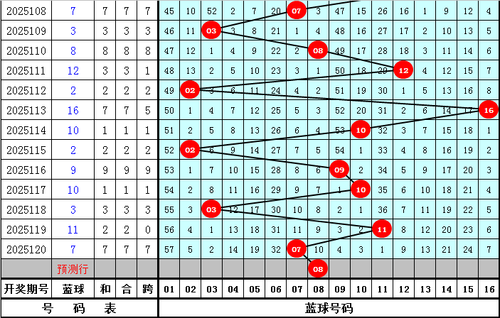 蓝球分析:第2025120期开出蓝球07,最近10期蓝球号码遗漏期数分别为:18期、13期、8期、20期、2期、54期、2期、8期、36期、11期,第2025121期蓝球注意08-14段出号,重点关注2路蓝球。第2025111期参考蓝球:08。