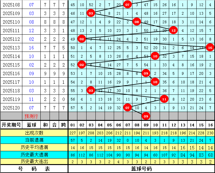 蓝球走势分析:上周二第25118期蓝球开出号码03,最近十周星期二蓝球号码大小比为4:6,奇偶比为3:7,012路比为2:4:4。本期蓝球建议侧重奇数号码,参考蓝球09、13。