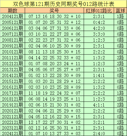 福彩双色球第2025121期历史同期王守礼012路奖号遗漏分析: