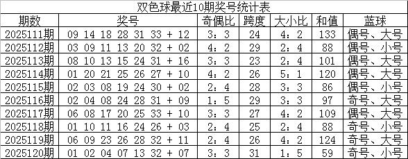 蓝球大小:近50期蓝球大小比为27:23,大号蓝球占优,近10期蓝球大小比为6:4,大号蓝球较热,本期注意大号蓝球11、14。