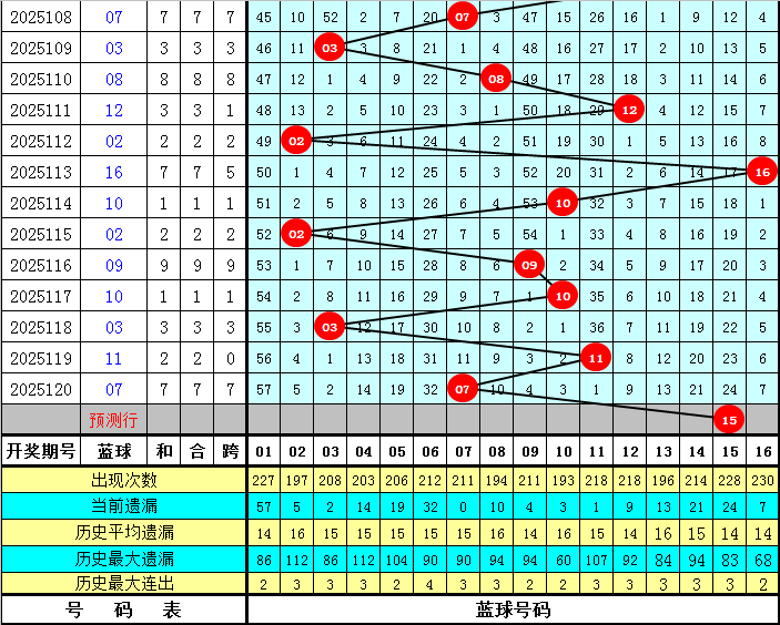 0路红球号码:上期全部轮空,表现非常冷。最近5期开出6个0路红球号码:06 09 24 33,其中0路红球号码大小个数相等,偶数0路红球号码表现活跃。本期参考0路红球号码:03 12 15 18 21。