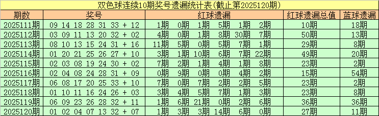截止双色球第2025120期,最近10期红球遗漏总值分别为:10期、50期、29期、49期、23期、15期、23期、23期、36期、27期,上期遗漏总期数偏高。