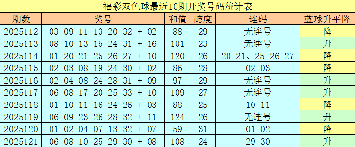 上期开奖:福彩双色球第2025121奖号开出:06 08 10 25 29 30 + 08,红球号码和值为108,首尾间距为24,包含连号:29 30。