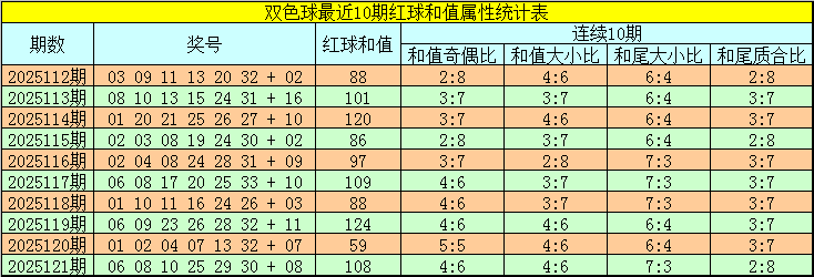 双色球红球最近10期开出和值分别为:88、101、120、86、97、109、88、124、59、108。