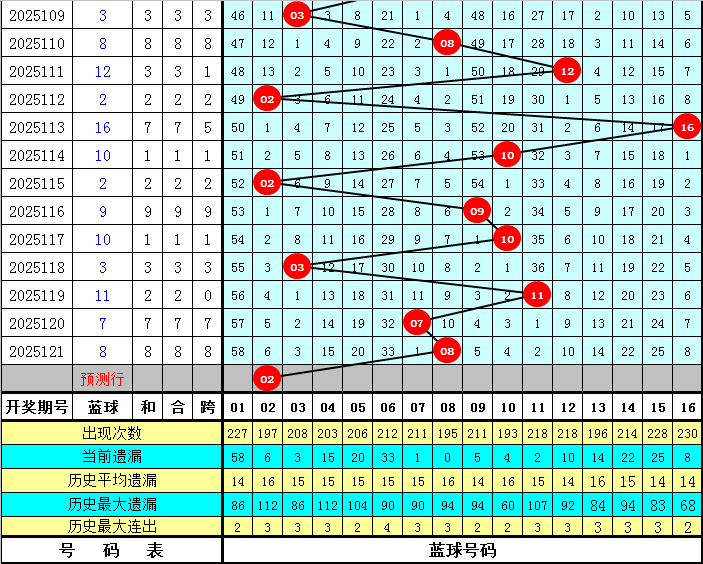 蓝球分析:上期蓝球为2路号码08,上升1个点位,最近50期开奖中,蓝球号码012路落号比为13:16:21,前10期蓝球012路落号比为2:4:4,本期蓝球关注2路号码,独蓝参考02。