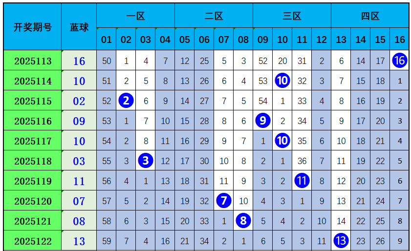 最近10期蓝球号码分别开出16、10、02、09、10、03、11、07、08、13,大小比为6:4,本期预测开出大数蓝球号码:10。