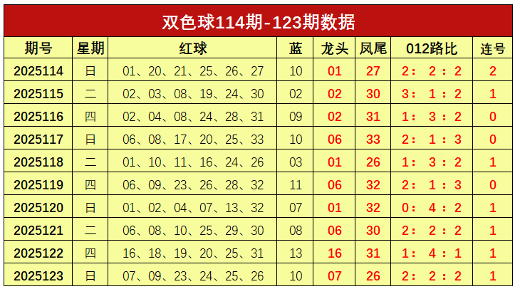 双色球第2025123开奖奖号:红球07、09、23、24、25、26,蓝球10。龙头07,凤尾26,012路比为2:2:2,开出1组连号。