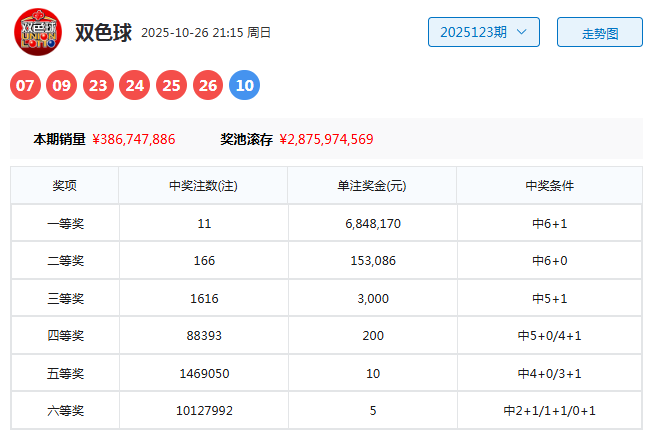 双色球25123期开奖,红球07 09 23 24 25 26,蓝球10。当期红球号码大小比为4:2,三区比为2:0:4,奇偶比为4:2。形态方面,红球开出1组四连号23 24 25 26;2枚斜连号24 26;1枚重号25。蓝球开出遗漏5期的偶数10。