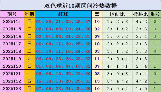 红球冷热分析:上期开出1个冷码,冷热比1:5,近10期冷热比开出27:33,冷热码热码多出。本期预计冷热码冷码多出,推荐冷热比4:2。