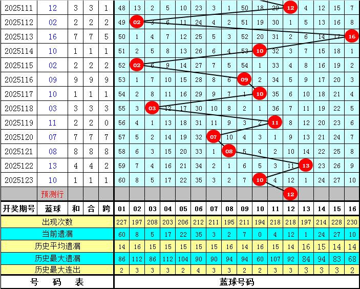 和值跨度分析:上期和值开出114,对比第2025122期和值下降了15个点位,本期预计和值在大号区域热出,看好出现在119附近。