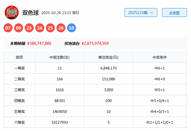 双色球第2025123期开出奖号为07、09、23、24、25、26+10。其中红球奇偶比为4:2,三区比为2:0:4,大小比为4:2,蓝球开出大号10。