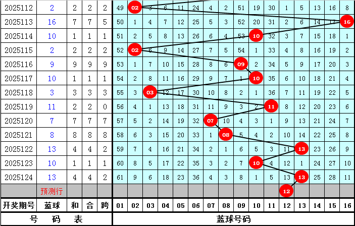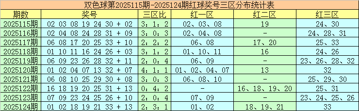 双色球第2025124期开出奖号为:01、02、18、19、21、33+13,其中红球三区比为2:3:1,蓝球开出奇数、大号、1路号码。
