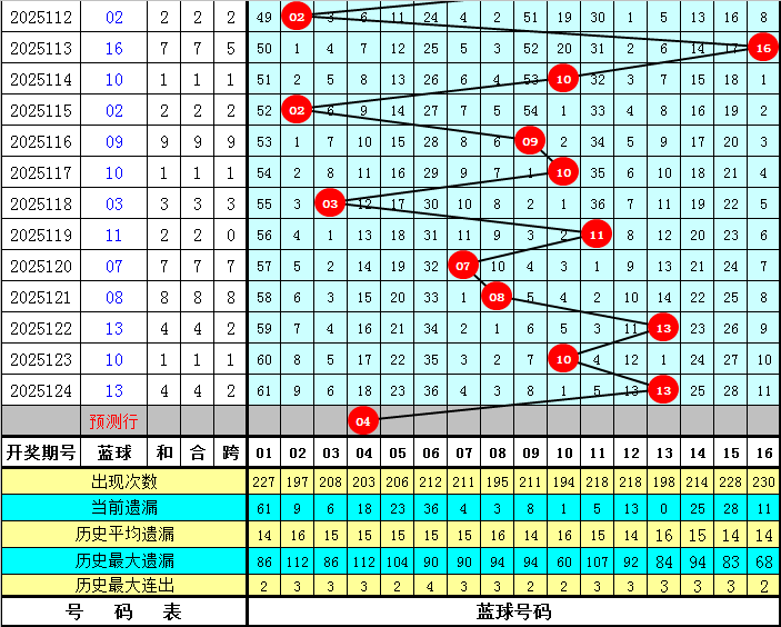 蓝球走势分析:上周四第25122期蓝球开出号码13,最近十周星期四蓝球号码大小比为7:3,奇偶比为6:4,012路比为3:4:3。本期蓝球重点关注偶数号,看好蓝球04、10。