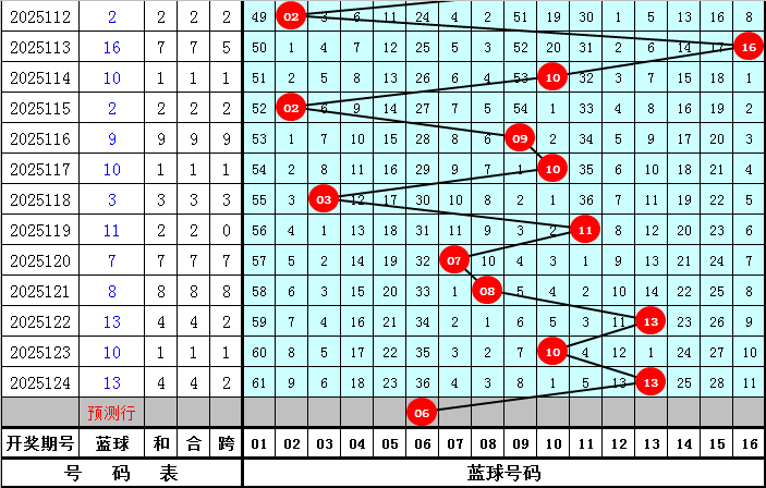 双色球第2025124期奖号为:01、02、18、19、21、33+13。其中红球和值为94,奇偶比为4:2,大小比为4:2,蓝球开出奇数、大号。